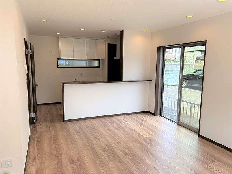 南側に大きな掃き出し窓を設けた開放的なリビング。3方向に大きな開口を設けて、たっぷりの陽光が採り込めます。