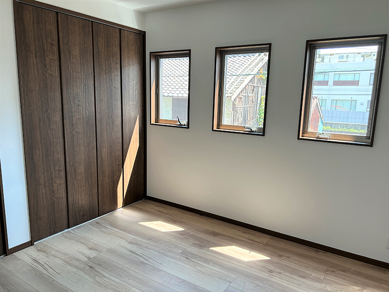 3連窓がオシャレな主寝室は、ゆったり8.4帖を確保。壁一面の大型収納は2つにセパレートしているのでご夫婦で便利に使えます。