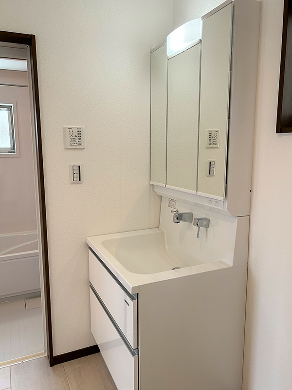 ゆったりと家事ができる広々とした洗面室。玄関からすぐの位置に設けた清潔動線です。