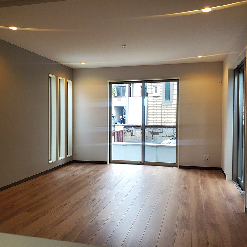 南東の2方向に開口を設けた明るく見通しの良いLDK。キッチンの奥に階段を設けたコミュニケーション設計です。